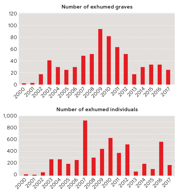 From the year 2000, there was a resurgence of historical memory in Spain. Even before the enactment of the so-called «Historical Memory Law» in 2007, several institutions and individuals had taken a stance regarding the need for legal regulation to investigate the consequences of Franco’s repression. The graph above shows the number of exhumed graves from the year 2000 to 2017; the graph below shows the number of individuals recovered in the same period.