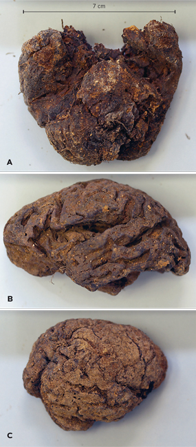 The preservation of these brains is extraordinarily surprising. Their size had reduced by between a seventh and an eleventh of their volume but they had acceptably retained their external morphology. Brain 25 (Figure 3b) is particularly noteworthy because its convolutions still retain a waxy appearance, and many cerebellar convolutions have been preserved in a good state in brain 11 (Figure 3a).