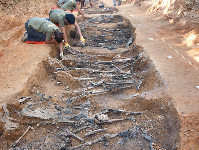 General aspect of the La Pedraja grave during the exhumation, which began in August 2010. According to historical data, the site was used from July to November 1936 to bury the victims of murders from nearby villages in Burgos and La Rioja.
