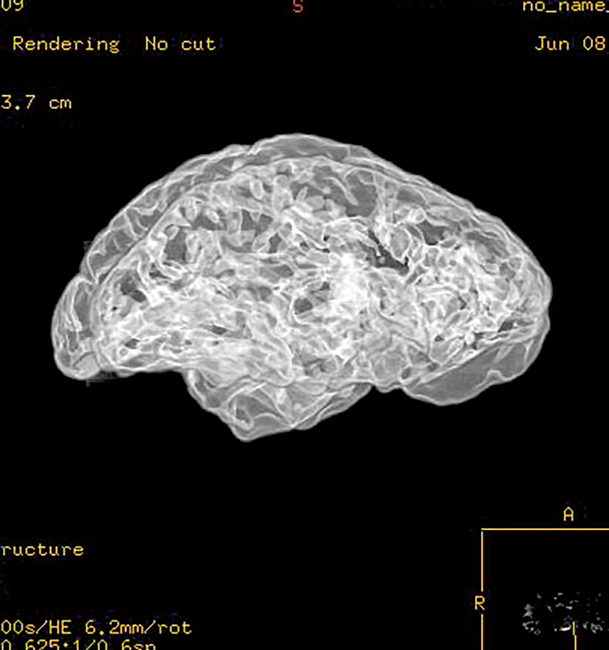 The radiological study (Figure 7) also offered interesting results: it verified the different radiological density of each of the brains. None of them showed areas with intra-parenchymatous calcification. However, the radiological consistency of the three brains was very different and correlated with their weight. Although an increase in density in both frontal poles was detected in brain 11, the computed axial tomography (CAT) scan showed evidence that this increase may have been an artefact related to the presence of soil remains in the brain surface. The CAT scan also allowed the acquisition of DICOM (digital imaging and communication in medicine) images for modelling. The analysis of tomography images from these three brains allowed us to rule out the presence of masses or marked differences in density within the parenchyma, as well as bone or metallic elements. Of note, brain hydration made it possible to successfully perform nuclear magnetic resonance (NMR) scans while, in our experience, NMR is not useful when performed on non-rehydrated brains (Serrulla et al., 2016).