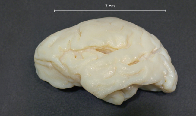 The radiological CAT study (Figure 7) provided digital images of the brain for modelling purposes. Thus, the image shows a model of brain 25 created by stereolithography using polyresin. This technique allows the morphology of the brain to be preserved for educational and museographic purposes because histopathological and toxicological studies completely destroy the brain structure.