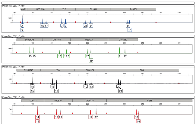 Source: Mercedes AlerThe analysis of SNPs (single nucleotide polymorphisms) is very useful. Because these are extremely small DNA fragments, it is more difficult for them to degrade and break down. There are also ancestry-informative markers (AIMs) which can be used to create the biogeographic profile of an individual. They are useful in the identification of unknown individuals who cannot be identified with a standard DNA profile. The image shows the genetic profile of 46 autosomal ancestry-informative indel markers analysed by studying DNA fragments in an automatic sequencer. Each peak in the electropherogram image represents a variant (allele) in the analysed individual.
