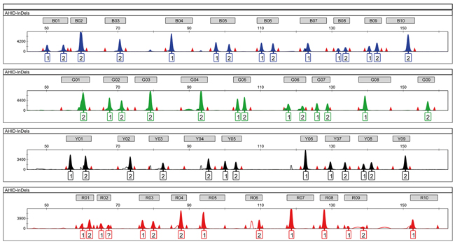 Source: Mercedes AlerWhen the poor quality of a DNA sample makes it difficult to create a complete genetic profile, the study can be extended by analysing other polymorphisms which are abundant in our genome. These include indels – simple biallelic insertion and deletion polymorphisms comprising one or a few nucleotide bases. The picture shows a genetic profile with 38 autosomal indel markers used for identification purposes and studied by analysing DNA fragments in an automatic sequencer. Each peak in the electropherogram image represents a variant (allele) in the analysed individual.