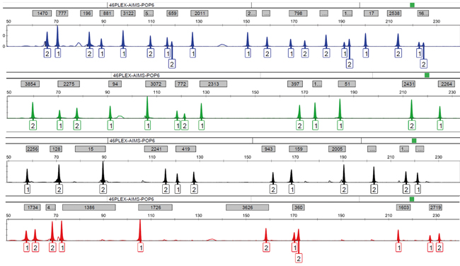 The analysis of SNPs (single nucleotide polymorphisms) is very useful. Because these are extremely small DNA fragments, it is more difficult for them to degrade and break down. There are also ancestry-informative markers (AIMs) which can be used to create the biogeographic profile of an individual. They are useful in the identification of unknown individuals who cannot be identified with a standard DNA profile. The image shows the genetic profile of 46 autosomal ancestry-informative indel markers analysed by studying DNA fragments in an automatic sequencer. Each peak in the electropherogram image represents a variant (allele) in the analysed individual.