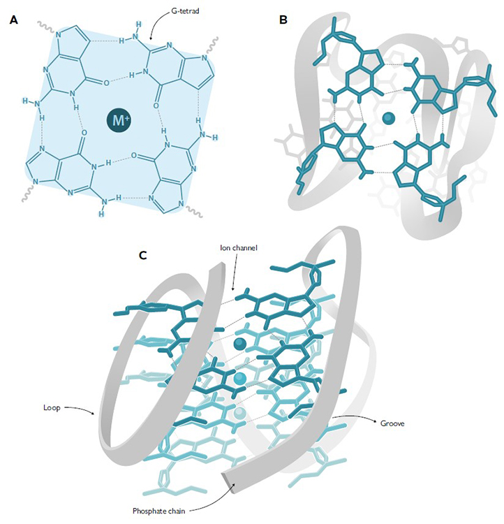 Xavi SepúlvedaG-quadruplexes are formed by rings of four guanines connected by hydrogen bonds in a planar array, known as G-tetrads. The graphics show the following: A) The molecular structure corresponding to a G-tetrad. M+ represents the cation (sodium or potassium) with its charge and the discontinuous lines represent the hydrogen bonds between guanines. B) A top-down view of a G-quadruplex with a highlighted G-tetrad. C) Representation of a G-quadruplex. The spheres represent the cations; the main structural motifs of the G-quadruplex such as the ionic channel, groove, loop, and phosphate chain marked with a grey line have been highlighted.