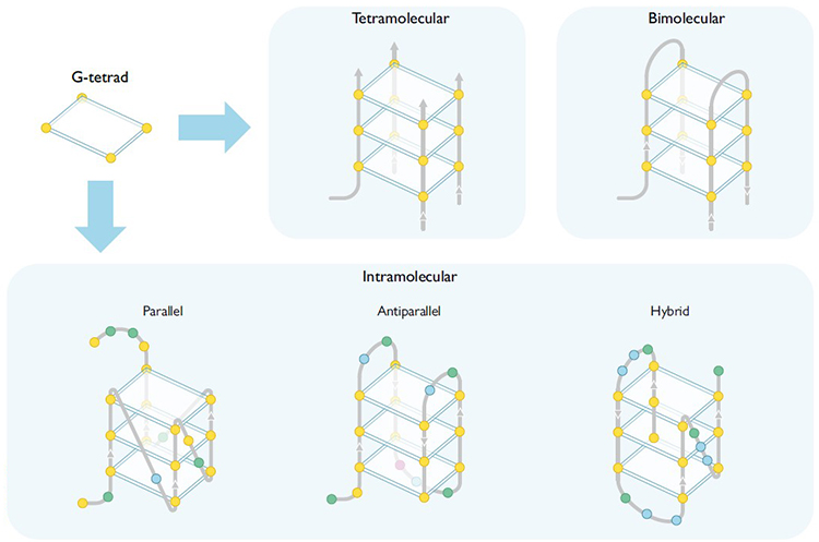 Representative diagrams of the different conformations that a G-quadruplex can adopt, depending on the number of chains (tetramolecular, bimolecular, and intramolecular) and their orientation (parallel, antiparallel, and hybrid). The spheres represent the nitrogenous bases, which are identified by colour, with yellow being guanines, green adenines, red cytosines, and blue thymines.
