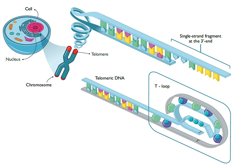 Xavi SepúlvedaTelomeres are located at the ends of chromosomes and consist of regions of non-coding, highly repetitive DNA sequences. Their function is essential to maintain chromosome integrity in processes such a gene recombination, chromosome fusion, and nuclease degradation. In short, telomeres preserve genetic information during cellular division and thus preserve the integrity and functionality of genes over time. More specifically, telomeric DNA consists of a repetition of guanine-rich nucleotides – usually TTAGGG for eukaryotic cells – between 9,000 and 15,000 nucleotides long. Although telomeric DNA has a double helix conformation, the 3’-end always contains an extra single-stranded DNA fragment which is 50–300-bases long that is not required by the complementary chain (Figure 3).