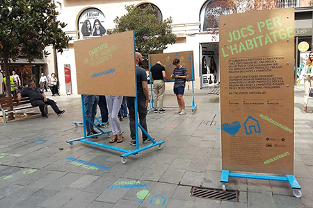 Street experiments allow passers-by and neighbours who want to participate to reflect for some minutes about an issue related to a shared concern in the community, collective, or specific group of citizens. People cease to be mere passive experimental subjects and the obtained data are valuable at least for the community behind the project, formed by people who want to know the reaction of their fellow citizens to a specific social problem. In the picture, one of the interventions for the Jocs per l’Habitatge (“Games for Housing”) project in Granollers (Barcelona, Spain).