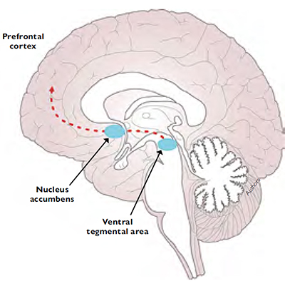The brain reward system is a circuit that corresponds to the cortical-mesolimbic dopaminergic pathway. This pathway includes projections that start in the ventral tegmental area and end in the nucleus accumbens, connecting with other structures such as the prefrontal cortex, which regulates the behaviour promoted by the reward system. In addition to «hijacking» or «hacking» this system, repeated drug use leads to a disconnection with the prefrontal structures that would normally curb harmful behaviour.
