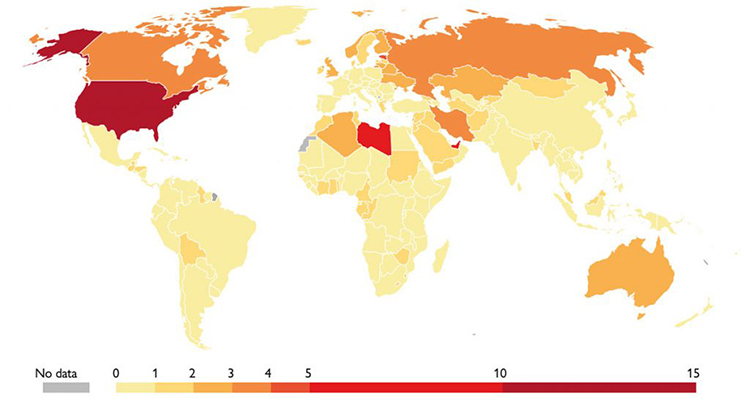 Map showing the world-wide death rates from opioid overdoses for 2017, measured as the number of deaths per 100,000 individuals. With 13.34 death per 100,000 people, the United States lead the raking above countries such as Libya (7.27) and the United Arab Emirates (5.4).