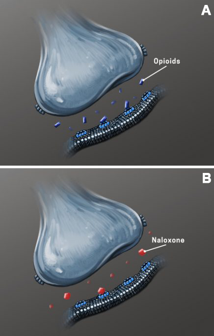 Opioid receptors (seen in bright blue in images A and B) are found on nerve cells around the body and have several effects when activated by opioid substances, such as feeling of comfort and sleepiness. As an opioid antagonist, naloxone sits on opioid receptors (image B), blocks them, and knocks other opioids off. Naloxone was approved in 1971 for the treatment of opioid overdose, and new products have been recently approved, such as an intranasal formulation approved by the FDA in 2015.