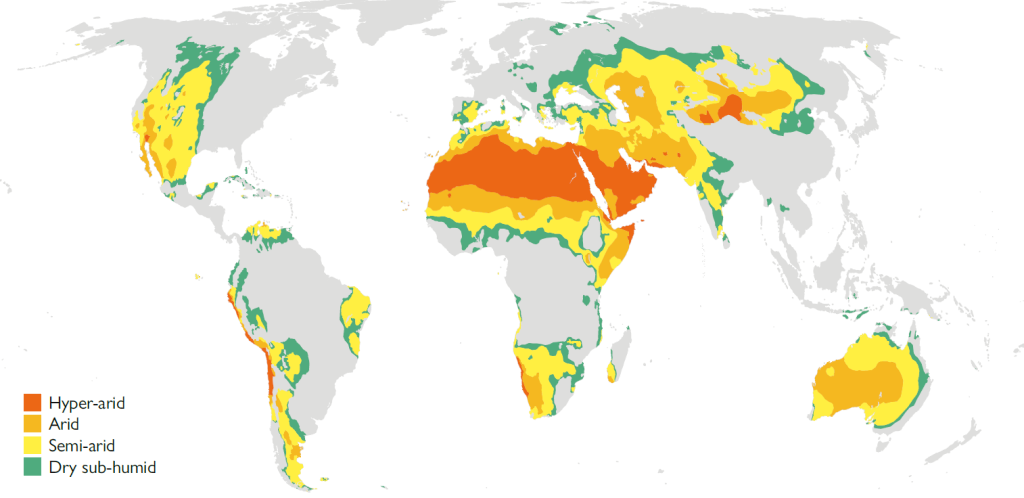 Distribution of the world’s drylands according to their aridity category (UNEP-WCMC, 2007). Depending on the methods used to calculate it, between 37.2 % and 46.2 % of the surface area of the planet is estimated to consist of drylands.