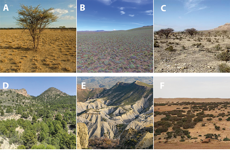 Dryland vegetation is often sparse and scattered. The images show several examples of the landscape found in drylands around the world. (A) A savannah in Kenya. (B) A scrubland in the Patagonian Steppe, Argentina. (C) Bou-Hedma National Park, Tunisia. (D) Aleppo pine (Pinus halepensis) groves in Alicante. (E) Tabernas Desert, Almeria. (F) Atlantic Sahara.