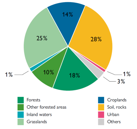 The distribution of land use in drylands. The type of barren landscapes with little vegetation popularly associated with these regions occupy only 28 % of their surface area. The same percentage is covered by forests or wooded areas and, of the remainder, 25 % is grassland and 14 % cropland.