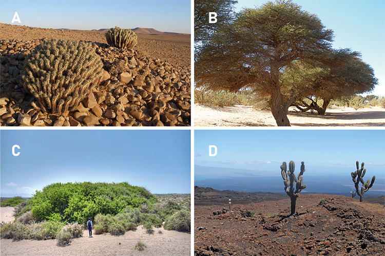 The unexpected assortment of life in these areas is a result of the adaptations of their biota to the specific conditions of these regions. The picture shows typical dryland vegetation: (A) Euphorbias, (B) acacias in the Atlantic Sahara, (C) a jujube tree (Ziziphus lotus) in Almeria, and (D) candelabra cactus (Jasminocereus thouarsii) in the Galapagos Islands, Ecuador.