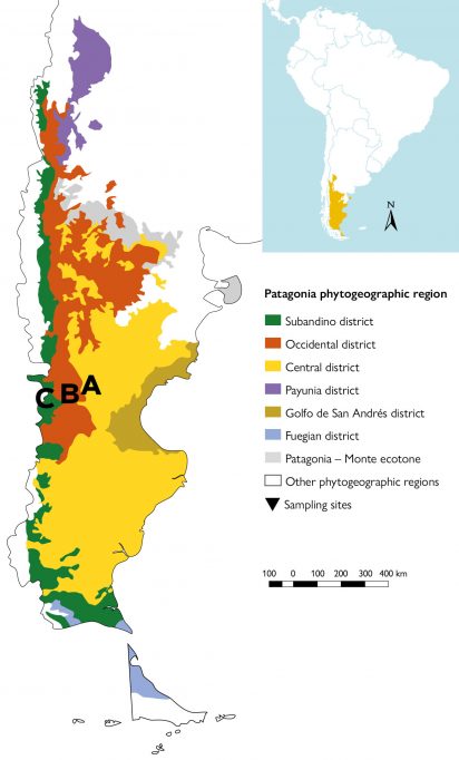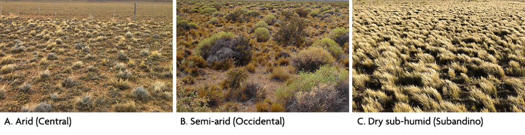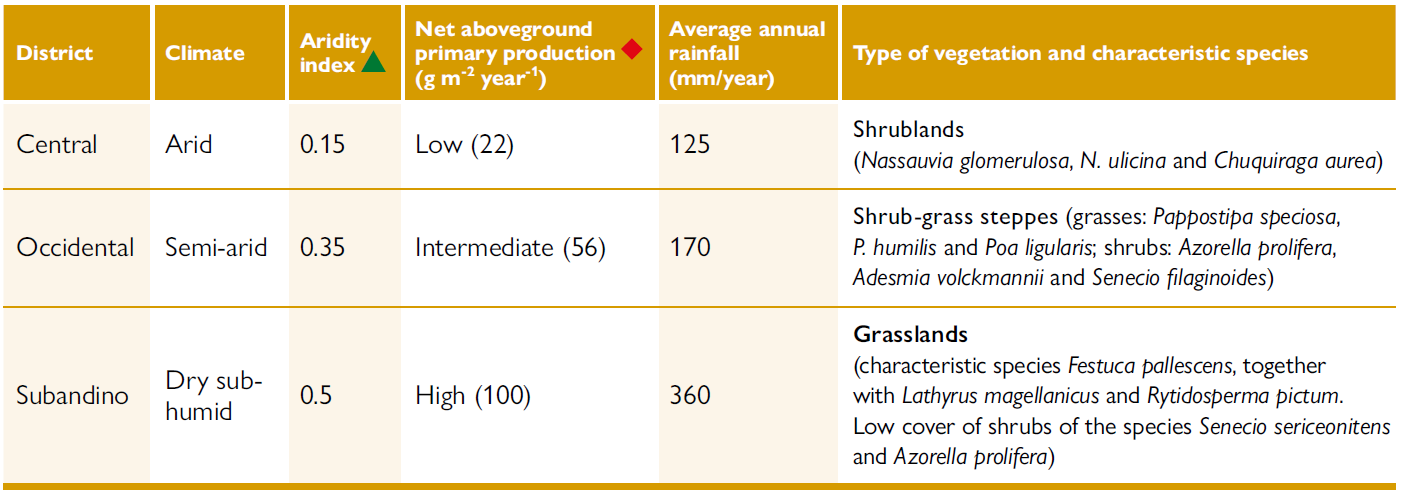 In southern Argentina, rainfall concentrates during the winter, between June and September, and notably decreases from west to east, resulting in a huge variability in aridity levels within just a few kilometres. These changes in rainfall are associated with notable differences in vegetation that give rise to vegetation subunits, known as phytogeographic districts (León et al., 1998; Oyarzabal et al., 2018; Figure 1). In this current work, we focused on the region located south of the province of Chubut, which contains different vegetation units belonging to the Central, Occidental, and Subandino districts of the Patagonian phytogeographic region (Figure 1). There is a transition from shrublands to grass steppes, with increases in vegetation cover and net primary productivity from the most arid area in the eastern Central region to the humid Subandino region in the west (Austin & Sala, 2002) (Table 1).