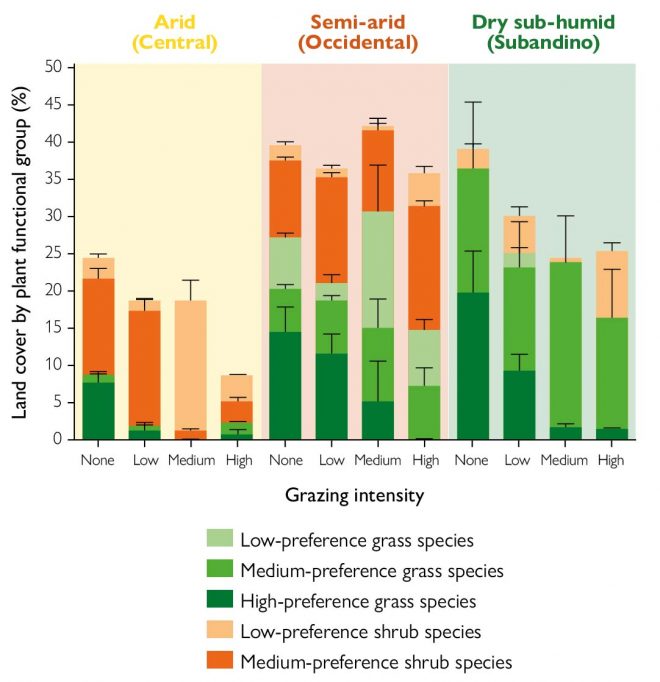 Land cover by plant functional group (%) as a function of grazing intensity (none, low, medium, and high grazing intensity) in sites with different aridity in the Argentine Patagonia (adapted from Carboni, 2019).