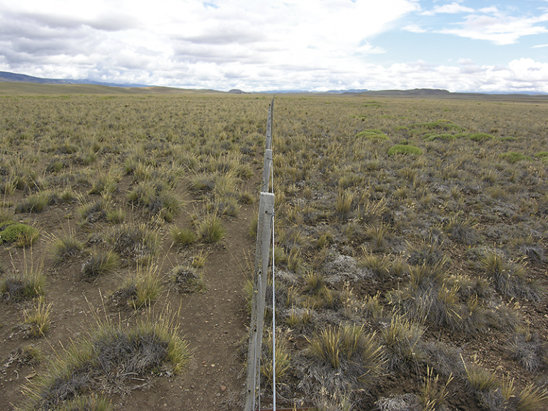 Areas of sub-humid grasslands subjected to different grazing intensities. The area on the left of the wire was subjected to greater grazing pressure. The reduced cover and size of the plants as a consequence of increased livestock pressure is evident.