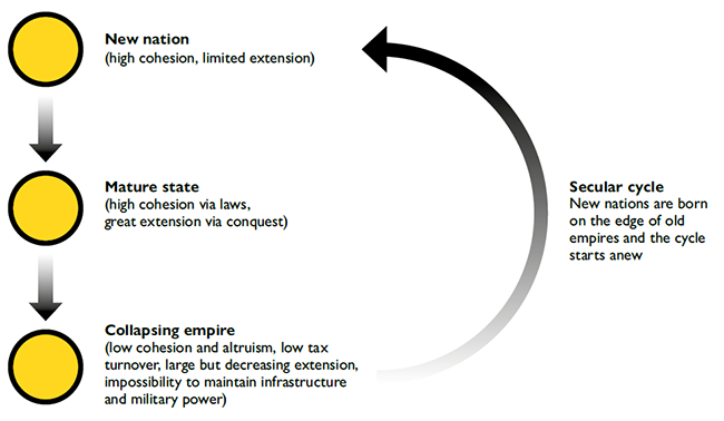 First, Turchin establishes the need to translate verbal theories into mathematical models. This way causal links between variables can be formalized, allowing us to make testable, quantitative predictions and reach conclusions regarding the fabric that binds us to social structures. Furthermore, this wealth of theory and models needs to be tested against a robust dataset of coarse-grained historical variables, like demography and nation size. In particular, Turchin analizes global trends of rise and fall of empires and nations and realizes that there are regular patterns he calls secular cycles: dynamical similarities in the way nations coalesce, grow in power into overextension, and collapse in extension and population over the course of a few centuries (Figure 1). These cycles are not the result of exogenous causes acting on political, economic or social dimensions, but endogenous processes with feedback operating and very long timescales.