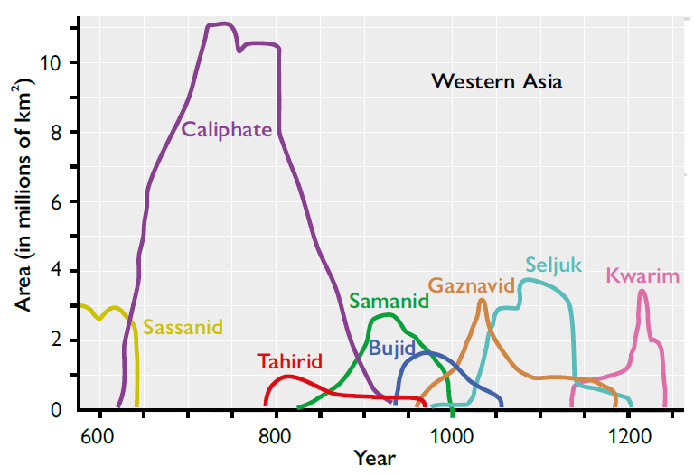 Source: Redrawn from Taagepera (1997)Example of empire historical dynamics in Western Asia. Several polities were born over the course of six centuries, rising, maturing and then collapsing (being substituted by newer nations).