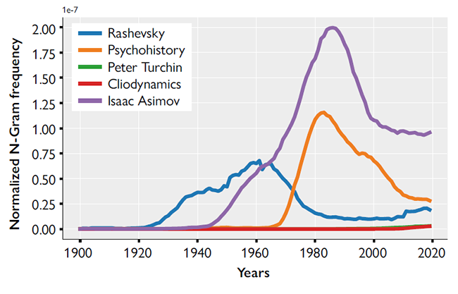 Books provide us with unique insight into cultural evolution from the origins of writing, and their digitisation allows us to trace conceptual evolution and usage across printed literature. Usage frequency over time of Rashevsky, psychohistory, Peter Turchin, cliodynamics, and Isaac Asimov in millions of printed books (1900–2019). Thanks to digitised data, we can observe the periods in which these concepts were most used in literature.