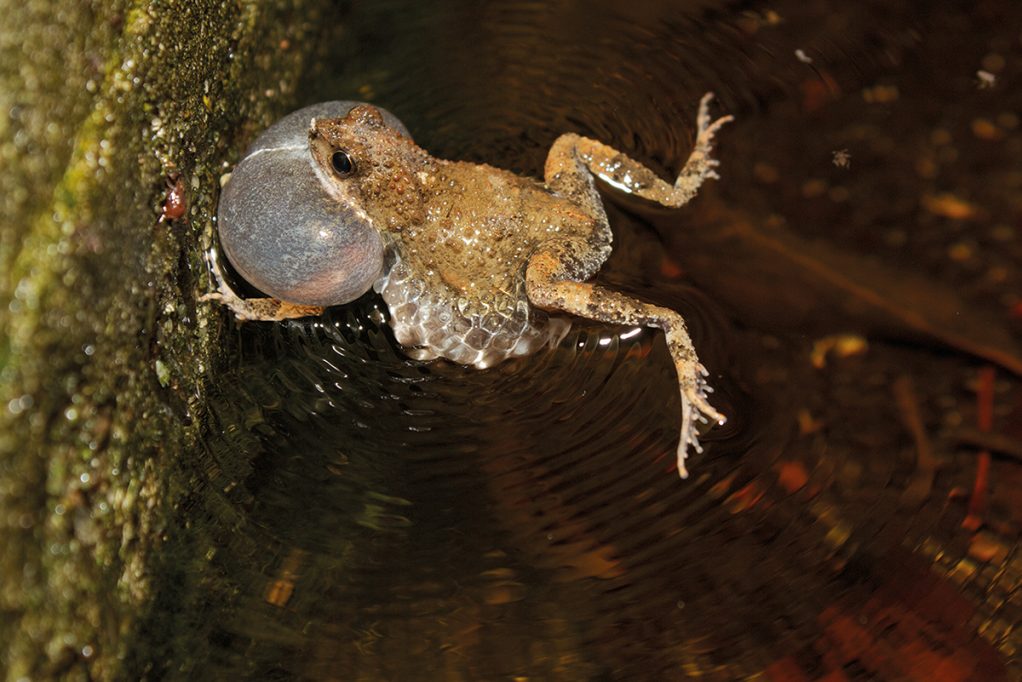 A calling male túngara frog (Engystomops pustulosus). Animals develop courtship strategies based on the stimuli to which they are sensitive. The male túngara frog and its closest relative are the only ones to use the basilar papilla for communication, and the pitch of their call evolved to coincide with the pre-existing tuning biases in the basilar papilla. This extra sensory stimulation results in females finding those calls much more sexually beautiful.
