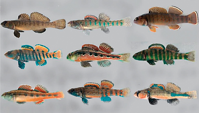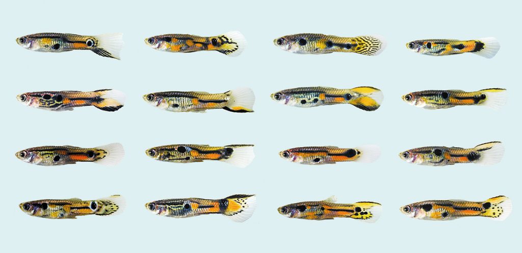 A sample of variation in coloration of male guppies from Trinidad (Poecilia reticulata). This fish is known not only for an assortment of colors in males but also for the variety of patterns in which these colors occur. Guppies might be capitalizing on a perceptual bias for high contrast, which can be achieved by a variety of patterns.