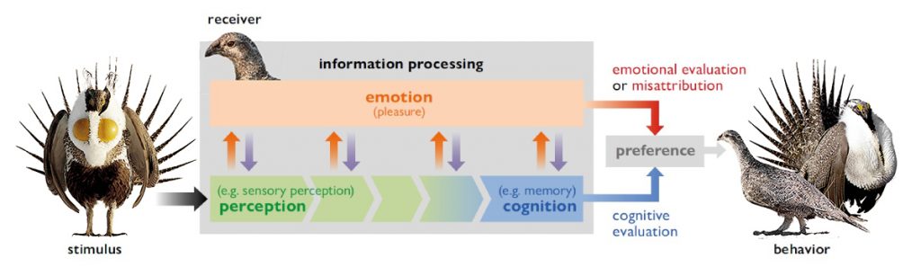 Anne HoudeEnvironmental stimuli (e.g., a male sage grouse courtship display) are processed by perceptual and then cognitive neurons of a receiver (e.g., a female sage grouse). When information processing is effective or efficient (e.g., when a display mimics the spatial statistics of natural scenes; orange arrows), it generates pleasure. This pleasure could contribute to a fast and positive emotional evaluation (red arrow) and could further regulate the process of information gathering (e.g., motivate further attention; violet arrows). The pleasure response is misattributed to the stimulus, rather than to the information processing, thus biasing appetitive behavior towards the stimulus (red arrow).
