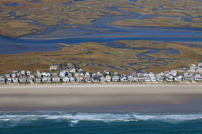 In the mid-1970s, some photographers chose an aerial perspective to show the impact of human activity on the natural environment. Other contemporary projects, such as Nature’s Edge (USA), use aerial photography to show the contrast between the natural and man-made environment, or from another perspective, our impact on the environment. This 2017 picture shows coastal housing at the Rachel Carson National Wildlife Refuge, Maine (USA).