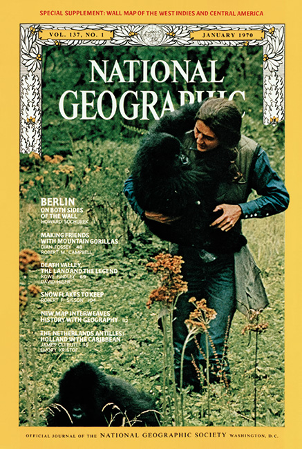 The American zoologist Dian Fossey spent much of her life studying the social behaviour of eastern gorillas (Gorilla beringei) in the wild. In 1970, a photographic report entitled «Making friends with mountain gorillas» featuring images taken by photographer Robert M. Campbell was published in the National Geographic. The impact of Campbell’s photographs demystified gorillas as wild and dangerous animals and led to action and financial support to save the species from extinction.