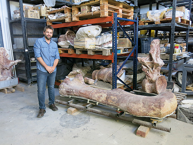 Palaeontologist Diego Pol with the femur of the holotype of Patagotitan mayorum at the Egidio Feruglio Museum, Trelew (Argentina).