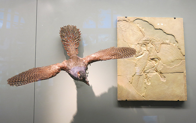 Replica of one of the fossils and live reconstruction of Archaeopteryx – the discovery that began to shed light on the relationship between dinosaurs and birds – in the Natural History Museum of Vienna (Austria).