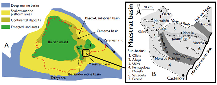 The Maestrat Basin (also known as Maestrazgo in the scientific literature) is a favourable area for the discovery of dinosaur fossils. This basin, which now covers parts of the Spanish provinces of Castellon, Tarragona, and Teruel, has been affected by two major rifting episodes. A rift is a structure that forms a zone of expansion within the continent and is filled with sediments. During the second episode, between the Upper Jurassic and Lower Cretaceous, a system of listric normal faults (faults with a high angle at the surface and an almost horizontal one at depth) divided the basin into seven sub-basins: Oliete, Aliaga, Galve, Penyagolosa, Morella, Salzadella, and Perelló (Figure 1). The sedimentary infill, which occurred at the same time as the second rift (between 156 and 102 million years ago), was more than 4 km thick. In the Maestrat Basin, this sedimentary sequence is characterised by the predominance of shallow-water marine carbonate deposits. When these sediments come from continental or transitional areas, dinosaur fossils are likely to be found there.