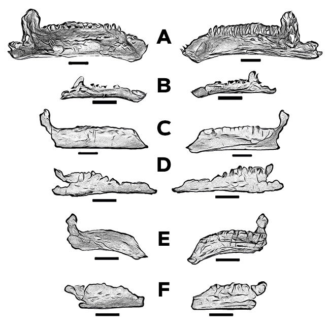 Mandibles (jawbone) of several hadrosauriform ornithopods mentioned in this article (medial and lateral views). The scale bars are 10 cm. A) Iguanodon bernissartensis (IRSNB-1561, horizontally reversed). B) Mantellisaurus atherfieldensis (NHMUK PV R 11521, horizontally reversed). C) Barilium dawsoni (NHMUK PV R 28660). D) Hypselospinus fittoni (NHMUK PV R 1831). E) Proa valdearinnoensis (AR-1-1365). F) Portellsaurus sosbaynati (MQ98-II-1). In the case of vertebrate fossils, the dental and cranial features are very helpful for establishing the morphological characteristics that define each palaeontological species.