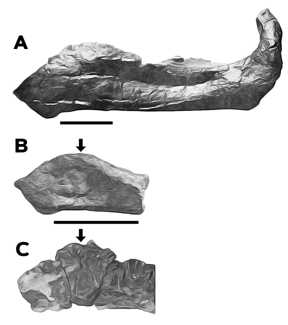 A) Left dentary (M-MQ 79-1), buccal view (redrawn from Santafé et al., 1982). B) Right juvenile dentary (SCH-10 [paratype]), medial view (redrawn from Sanz et al., 1984. Acta Geológica Hispánica, 19). C) Detail of the rostral end of the perinatal right dentary (MAP-5152) in a medial view (redrawn from Verdú et al., 2015). Arrows indicate the autapomorphy of Iguanodon galvensis, i.e., the characteristics found only in this taxon: dentary with the dorsal margin close to the symphyseal region with a short, abrupt, and pronounced convexity (Verdú et al., 2018; Verdú et al., 2021). Scale: 10 cm (A), 5 cm (B), and 1 cm (C).