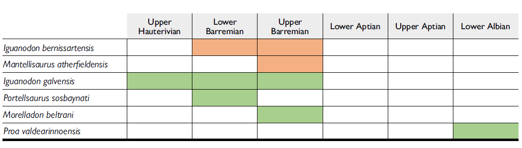 The diversity of hadrosauriforms in the Maestrat Basin was higher than in other parts of Europe, with up to six species present in an interval of only about 29 million years. The table shows the species of this clade present during the Lower Cretaceous in the Maestrat Basin. Orange marks the hadrosauriform ornithopod species described outside the Maestrat Basin also present in this basin, and green marks the species described in the Maestrat Basin.