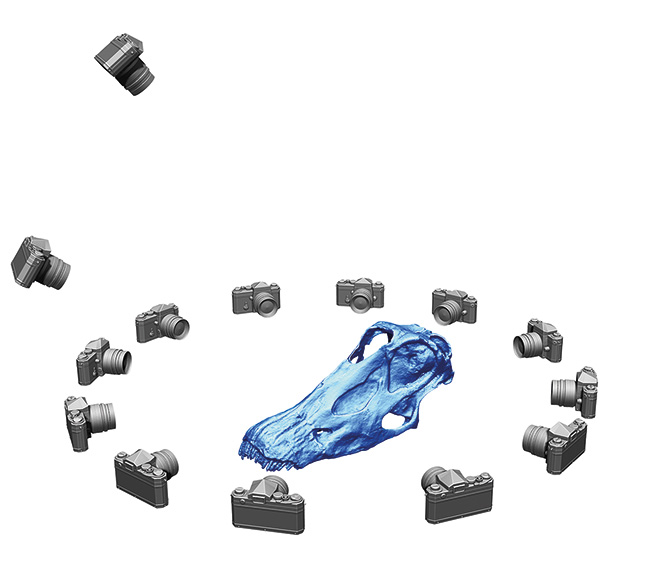 Schematic of the process of digitising a Diplodocus skull using digital photogrammetry, in which a large number of slightly overlapping photographs that cover the entire surface of the fossil are taken. These images are then processed in a computer to obtain a large number of homologous points between all the photographs, which are used to generate a virtual surface.