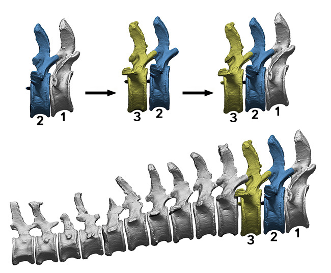 The process of articulating a sequence of a virtual caudal vertebrae of the sauropod Camarasaurus in a neutral posture. This technique is used to prevent preconceived ideas from having a significant effect on the eventual outcome of the curvature of the spine. First, the first pair of vertebrae is articulated to maximise the overlap of their articular surfaces. Then the first caudal vertebra is hidden and the third one is added, with only one pair of vertebrae visible at a time. The resulting curvature is the result of maximum articular contact, in case there were potential biases in interpretation.