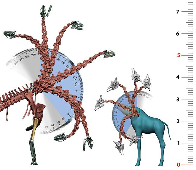 To find out whether these techniques are really capable of providing accurate data on sauropod palaeobiology, the most immediate approach is to assess whether they allow us to replicate the biological capabilities of modern vertebrates. Giraffes are the only vertebrates today that can be used as a model for the necks of sauropods: they are large quadrupeds that weigh over a tonne and have a long neck as a result of the elongation of their cervical vertebrae and the «cervicalisation» of their first thoracic vertebra. Notably, by applying the same techniques described for sauropods to modern giraffe skeletons, the skeletal reconstructions obtained correspond perfectly to the postures normally adopted by giraffes when walking (Vidal, Mocho, Páramo et al., 2020).