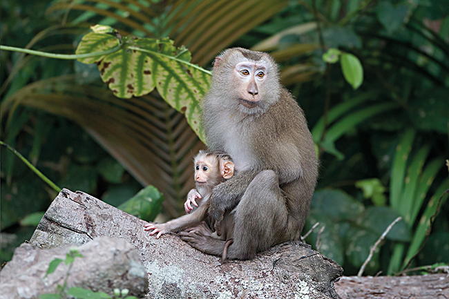 Several primate species preferentially engage in affiliative social interactions with their kin, which largely share their own genes, but they can also engage in long-term preferential relationships with unrelated individuals. In the picture, a pig-tailed macaque (Macaca leonina) with her offspring.