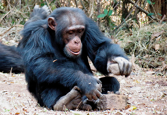 In several experiments, chimpanzees never used human-made tools as cutting tools to access food, although in the wild they do use them for a variety of foraging activities, such as cracking nuts. The image shows an adult male chimpanzee at Bossou (Guinea) cracking oil palm nuts.