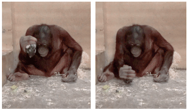 Orangutans can recognise a sharp stone as a potential tool and use it for cutting. They can also perform lithic percussion. However, in the experiments they do not combine these skills on their own: in experiments, they never made a sharp stone that they subsequently used as a cutting tool. Above, two moments from one of the studies (Motes-Rodrigo et al., 2022).