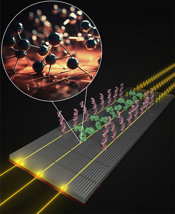 Surface chemistry is indisputably the best approach to firmly attach the bioreceptor molecules to the sensor surface, but there are still challenges to be addressed, especially for the functionalization of certain sensor materials. Above, illustration of an interferometric sensor functionalized with DNA strands (pink) and antibodies (green), allowing the simultaneous detection of different cancer markers (genomic and protein). Inset figure represents the chemical modification of the silicon-based sensor surface through silanization. The silanization method allows for coating an hydroxil-activated material with a monolayer of organic molecules (silanes) carrying specific terminal functional groups that can be employed for covalently anchoring different biomolecules.