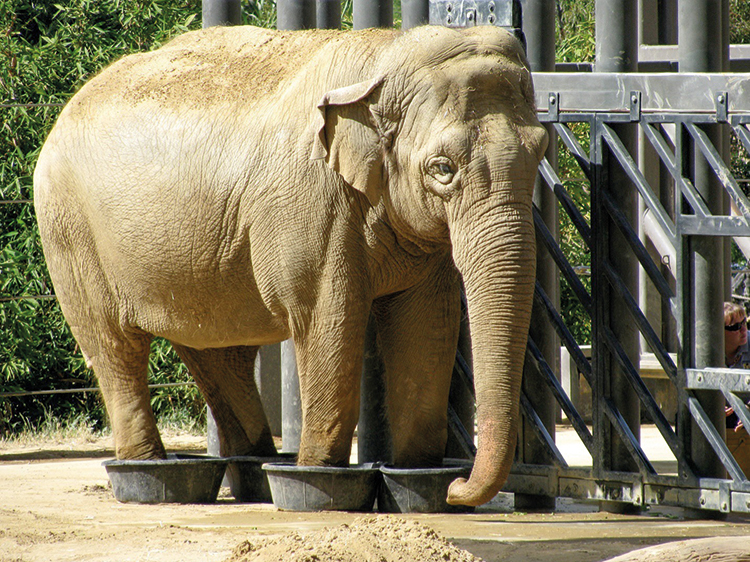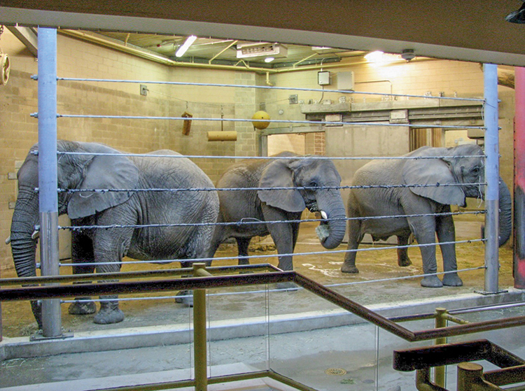 During cold weather, the elephants spend the majority of their time in this small space. Lack of movement and standing on hard surfaces are associated with foot and musculoskeletal disorders.