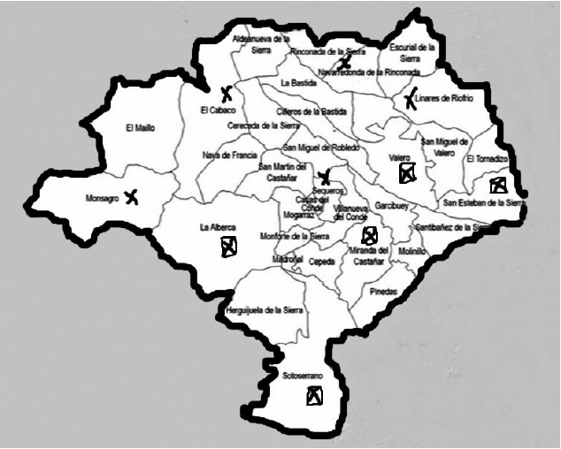 Si los fonos distinguidores, según las encuestas del ALPI, eran los únicos presentes en los años 30 en toda la provincia salmantina, podemos observar la penetración de fonos yeístas en zonas próximas: tanto en el sur de Castilla y León (en el sur de Ávila, concretamente en el punto de encuesta 452 Santa Cruz del Valle)7 como en la comarca norcacereña de las Hurdes (en el punto de encuesta 361 La Muela-Pinofranqueado).8