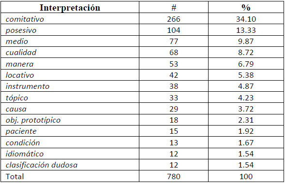 Las frases-con en español se presentan con una gran variedad de interpretaciones en el uso. Las investigaciones sobre el tema reconocen, además de los esperados valores de compañía (1a) e instrumento (1b), también los de medio (1c), cualidad (1d), manera (1e), concesión (1f), condición (1g), causa (1h) y locativo 0i), entre otros (Seco, 1961; RAE, 2010).1