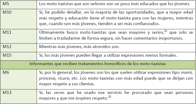 Según 12 de las 18 encuestadas, a menor edad del moto-taxista mayor será la posibilidad de que este sea más descortés con los apelativos empleados para referir a sus clientas. Esta opinión es compartida tanto por 9 de las mujeres mencionadas con FTNP, como por 3 encuestadas que reciben formas nominales honoríficas de los choferes. Aunque este aspecto podría estar sujeto a discusión al observar los testimonios de M9 y M16, pues las informantes aprecian que los choferes en un rango etario menor al de ellas son más respetuosos.