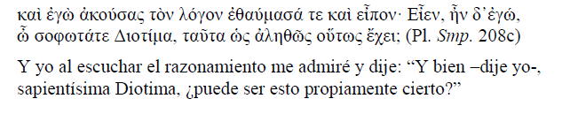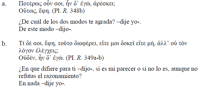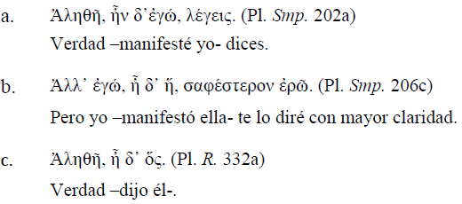 (5)De otra parte, en las duplicaciones en que interviene φημί, es este verbo el que satura siempre la posición del inciso. Como notó Fournier (1946:29), los incisos son un privilegio de φημί. Ahora bien, el pasaje de Pl. Smp. 208c, reproducido en (4), revela que la distinción se extiende a ἠμί.6 Tal homogeneidad es congruente con la idea de que las expresiones del Cuadro 1 son formas alternantes del mismo paradigma.