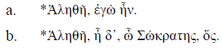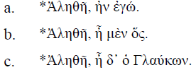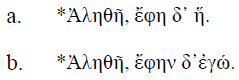 (7)Los pasajes revelan que la conmutabilidad de ἠμί y φημί está constreñida por el hecho de que las formas de ἠμί se comportan como bases morfológicas ligadas a términos que doblan sus valores de persona gramatical o (en la tercera) especifican los de género. Las de φημί, en cambio, son formas libres, en el sentido de Bloomfield (1964:138). De este modo, en (6a) ἔφη es sustituible por ἦ δ᾿ ὅς, como se comprueba en (7c), pero no por la expresión ἦ aislada, porque esta no es una forma libre en ático clásico. Esto explica la inexistencia en los textos de enunciados como los siguientes:
