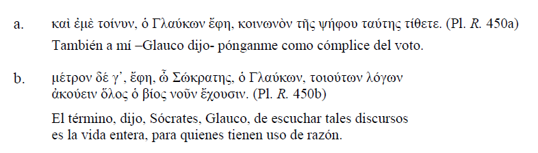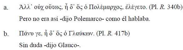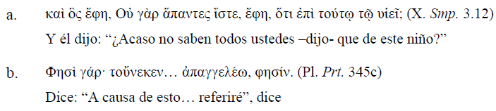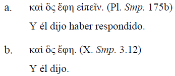 (4)El punto medular de la cuestión estriba en que las formas del complejo supletivo λέγειν/εἰπεῖν/ἐρεῖν están excluidas de la posición del inciso. De una parte, no se observan en los datos escrutados (añadiendo a los textos platónicos, El Banquete de Jenofonte) duplicaciones que se construyan solo con expresiones de este paradigma (por ejemplo, εἶπεν y ἔλεξεν ‘él dijo’, o εἶπον y εἴρηκα ‘yo dije’). La razón para ello no descansa en que en el complejo los elementos mantengan algún tipo de contraste (digamos, con λέγειν en el presente, εἰπεῖν en el pretérito y ἐρεῖν en el futuro), porque existen incisos idénticos a los verbos matrices que duplican. La idea del contraste no alcanza a la construcción no atestiguada en que εἰπεῖν, pongamos por caso, se duplica a sí mismo, como lo hace φημί en los enunciados siguientes: